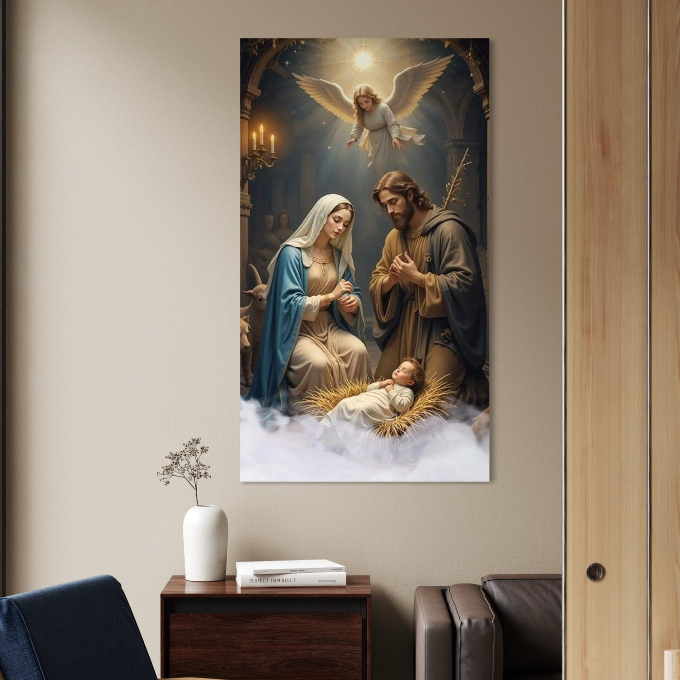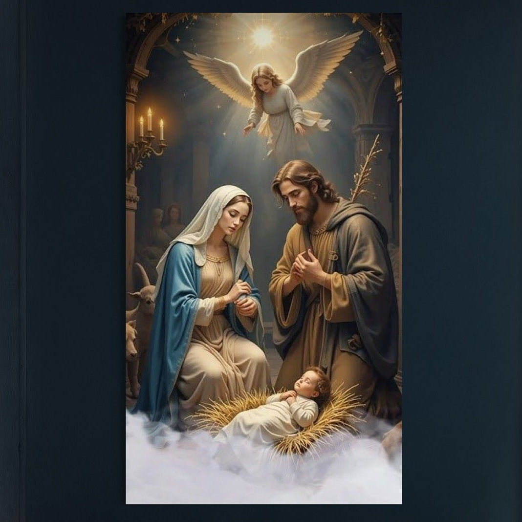 Tablou Canvas Premium, LuxCanva® D1112, Sfanta Familie, Liniste, Nastere, Betleem, Miracol, Craciun, Mantuitor, Isus, Inger, Fecioara, Maria, Iosif, Leagan, Prunc, Credinta, Har, Living, Dormitor - 50 X 90 / Doar Sasiu Lemn / Normala