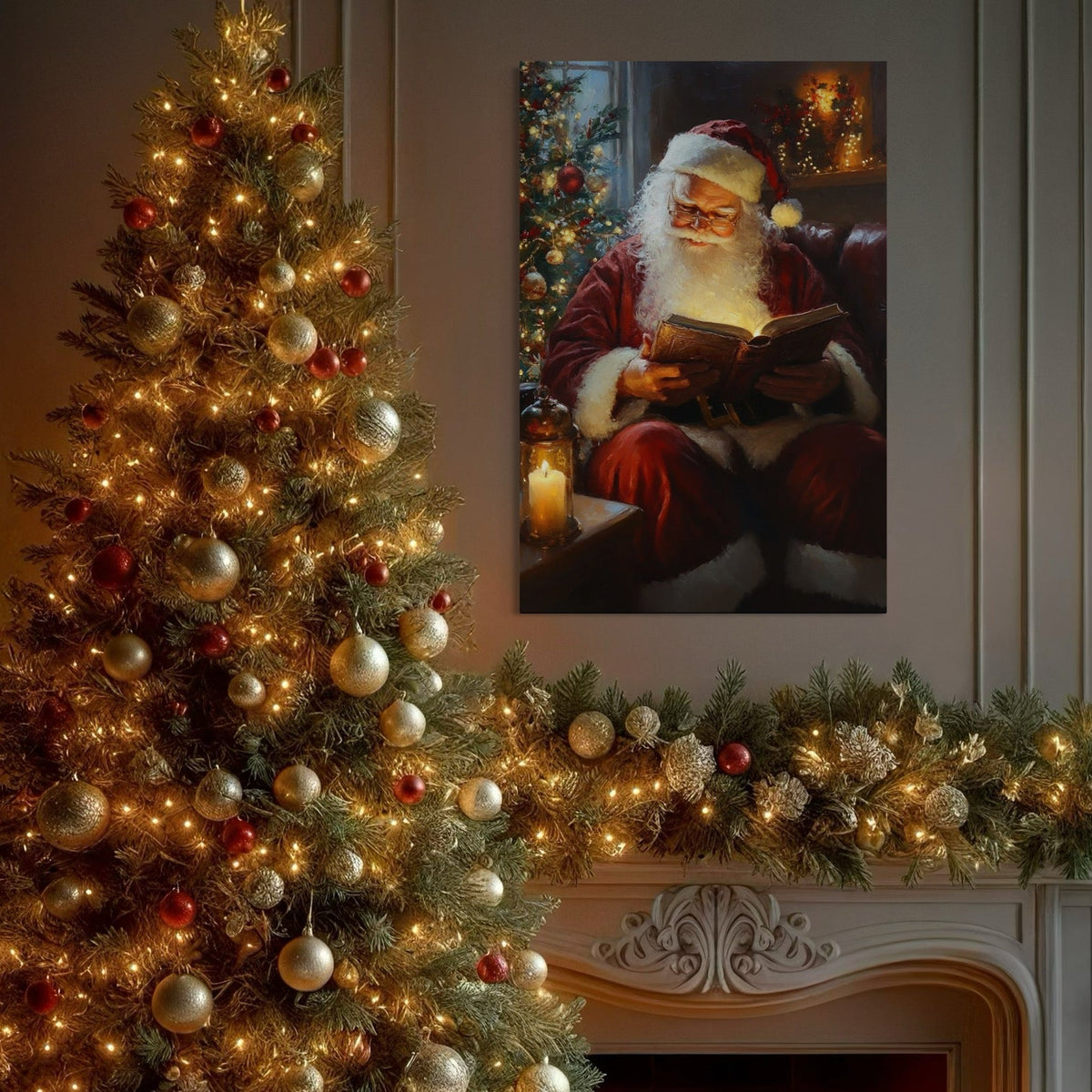 Tablou Canvas Premium, LuxCanva® D1118, Mosul si Cartea Fermecata, Carte, Povesti, Basme, Lumanare, Brad, Fotoliu, Citit, Ochelari, Mos Craciun, Felinar, Noapte, Ajun, Living, Dormitor - 40 X 60 / Doar Sasiu Lemn / Normala