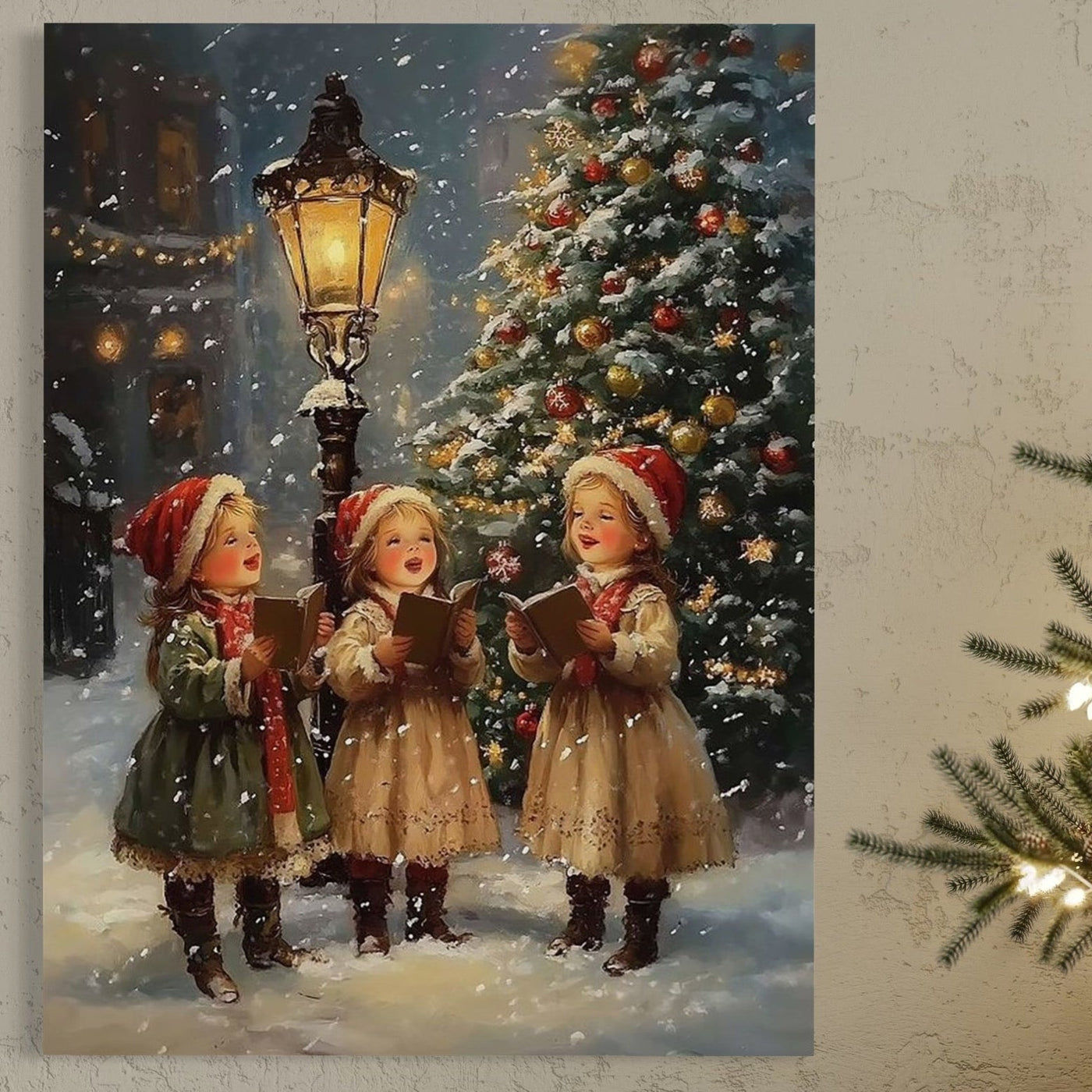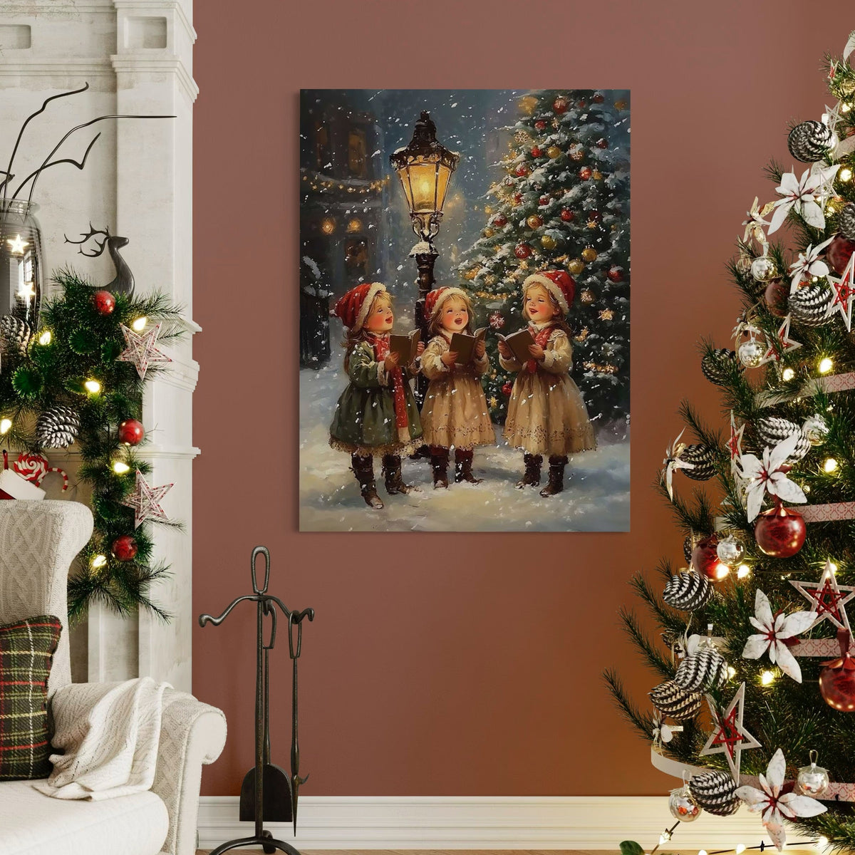 Tablou Canvas Premium, LuxCanva® D1129, Colindatori in Noaptea Sfanta, Colind, Iarna, Magie, Cantare, Fetite, Copilarie, Felinar, Brad, Zambete, Traditie, Emotie, Living, Dormitor - 45 X 60 / Doar Sasiu Lemn / Normala