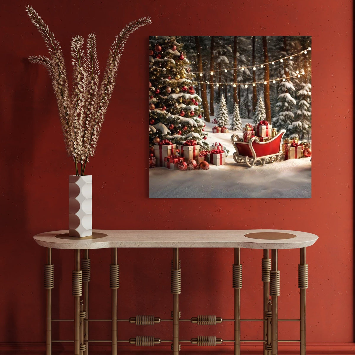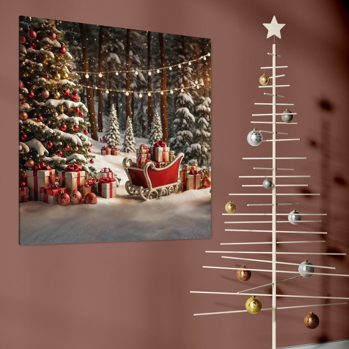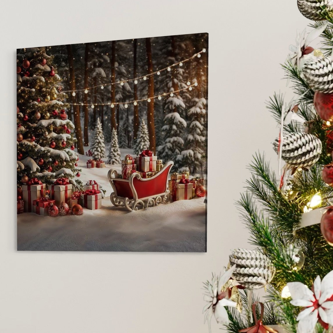 Tablou Canvas Premium, LuxCanva® D1130, Sania Fermecata a Craciunului, Sanie, Desaga, Cadouri, Noapte, Ajun, Reni, Zbor, Casuta, Padure, Poveste, Iarna, Living, Dormitor - 50 X 50 / Doar Sasiu Lemn / Normala