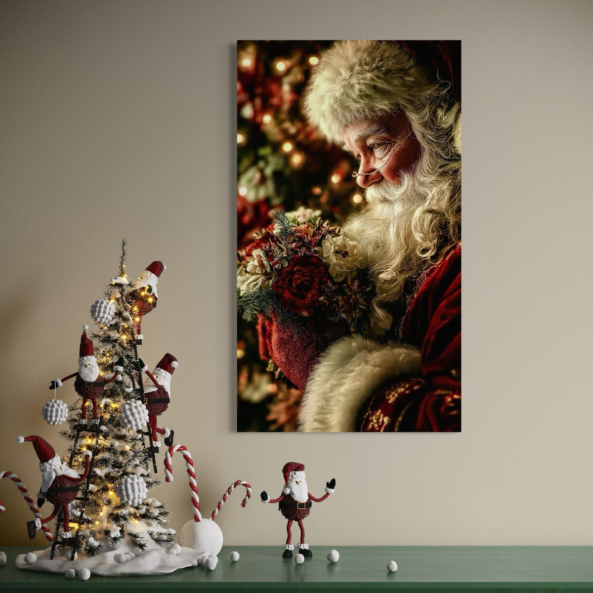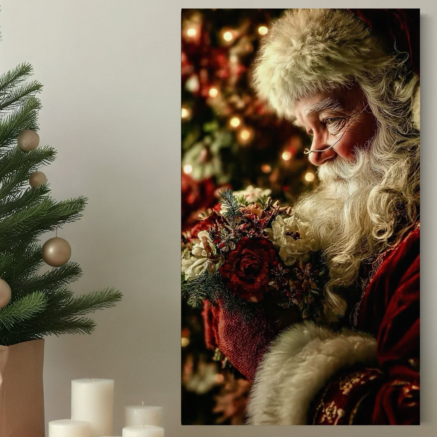 Tablou Canvas Premium, LuxCanva® D1139, Moment de Liniste cu Mos Craciun, Iarna, Ajun, Craciun, Mos, Rosu, Flori, Generozitate, Traditie, Blana, Alb, Barba, Trandafiri, Living, Dormitor - 40 X 70 / Doar Sasiu Lemn / Normala