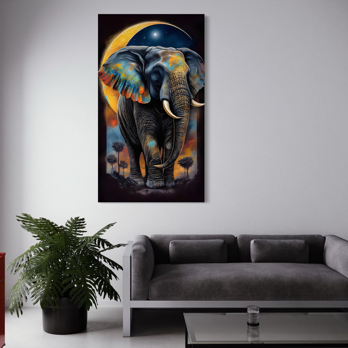Tablou Canvas Premium LuxCanva® C1012, Elefant Sub Cerul Instelat , Elefant, Safari, Luna, Living, Dormitor, Birou, Relaxare, Culori Vibrante - 50 X 90