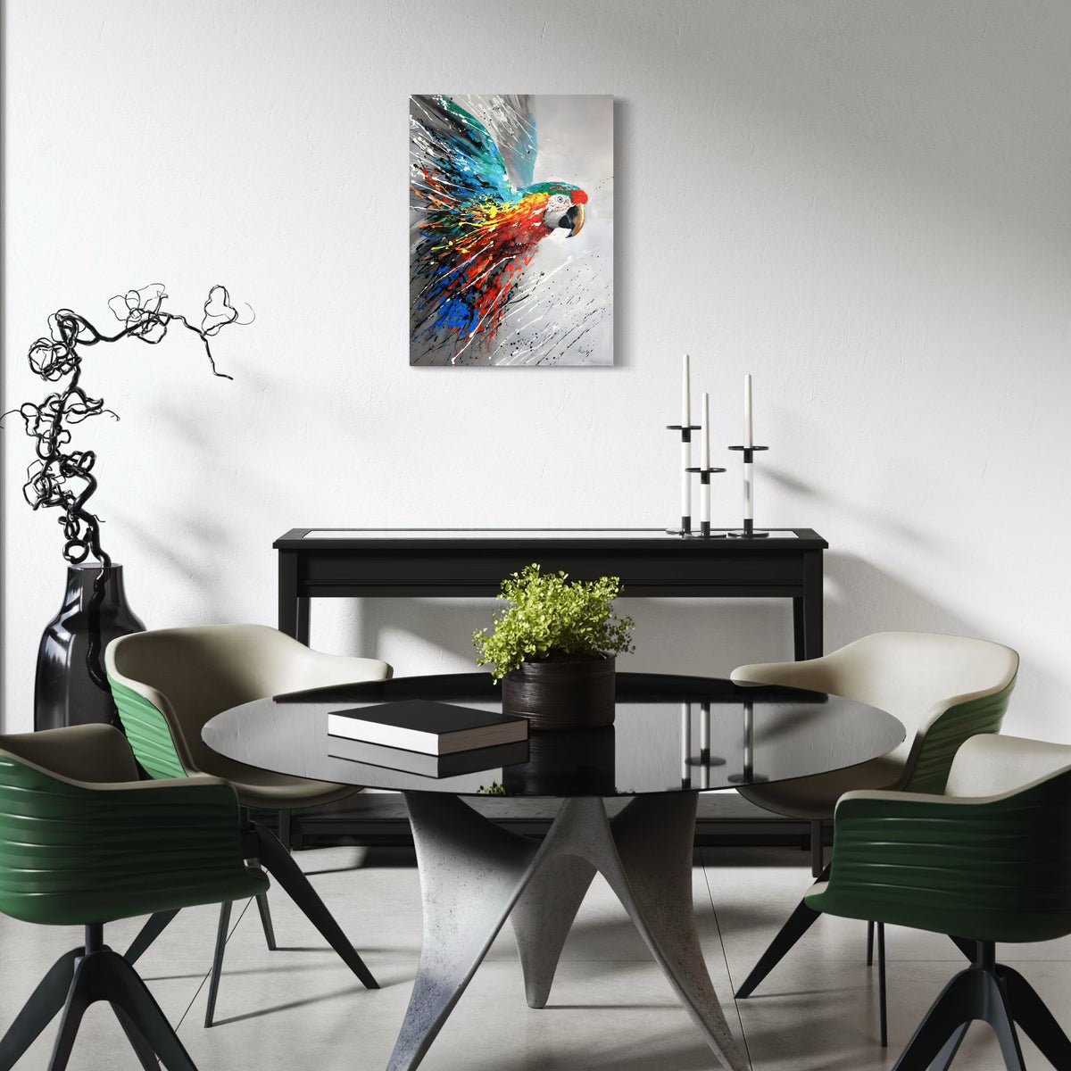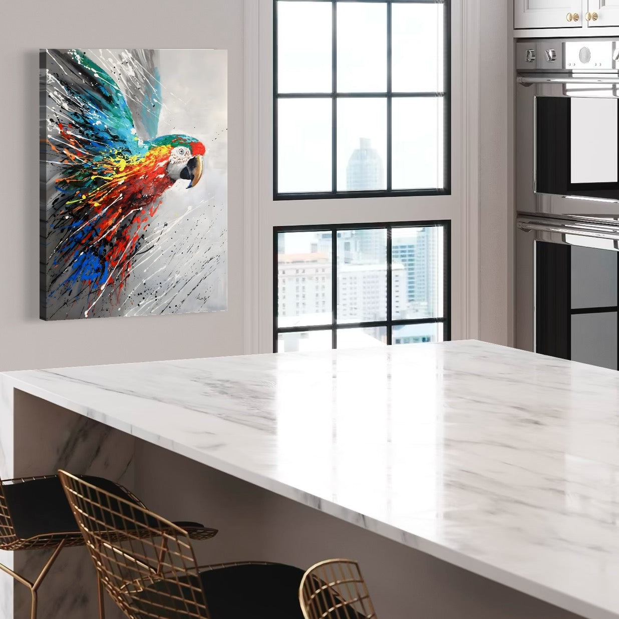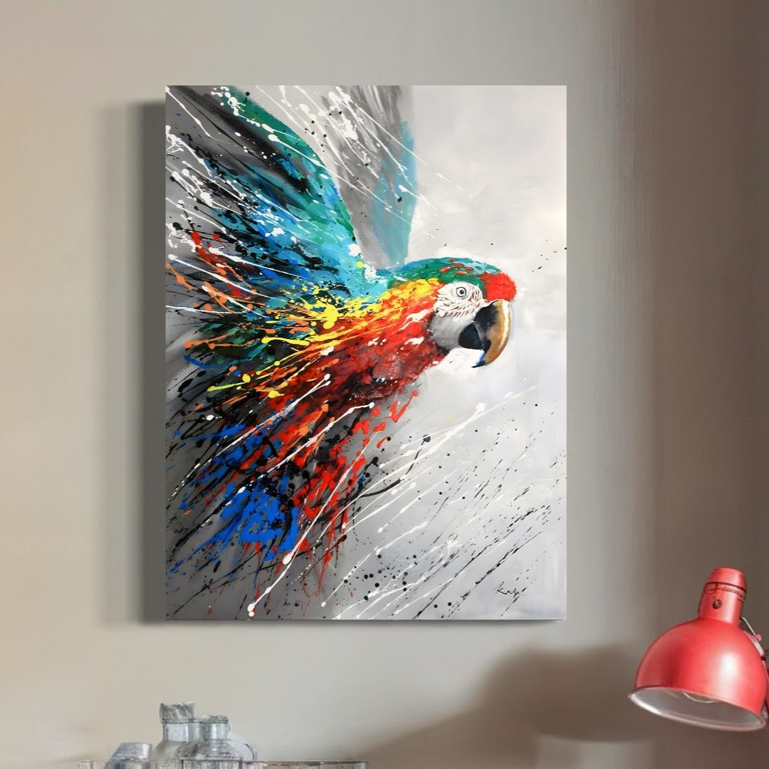 Tablou Canvas Premium LuxCanva® C1016, Papagal Zburand , Penaj Viu Colorat, Culori, Living, Camera Copilului, Birou, Relaxare, Culori Vibrante - 60 X 80