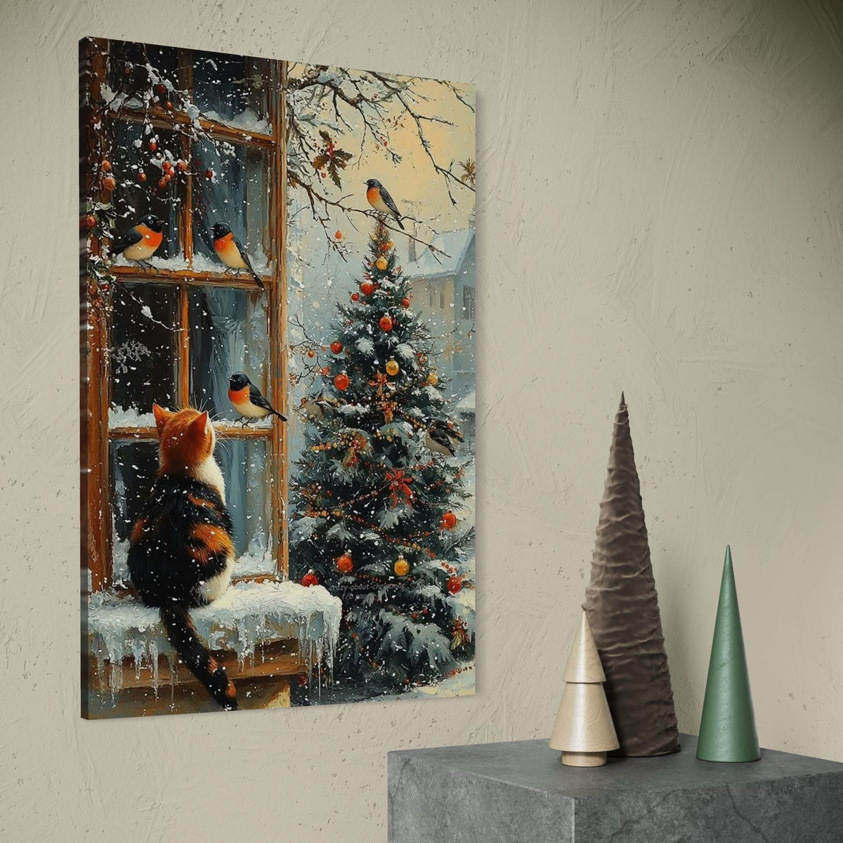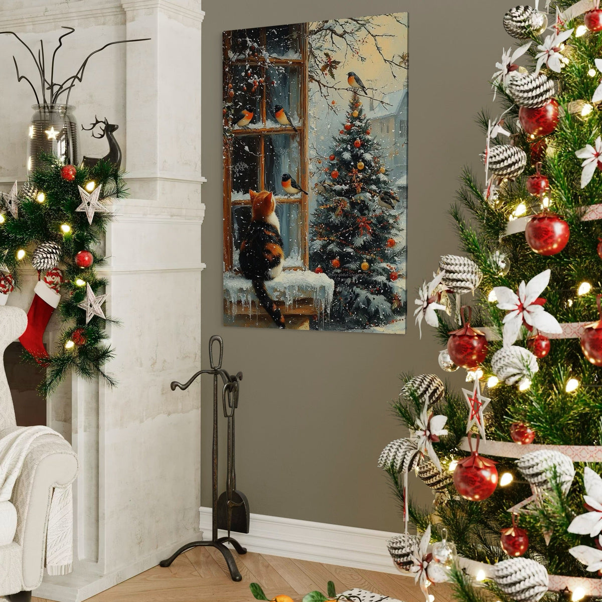 Tablou Canvas Premium, LuxCanva® D1097, Curiozitate printre fulgi, Pisica, Pasari, Natura, Privire, Contemplare, Visare, Fereastra, Craciun, Sarbatori, Magic, Fulgi, Zapada, Cartier, Living, Dormitor - 40 X 60 / Doar Sasiu Lemn / Normala