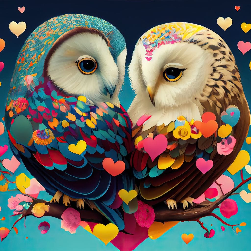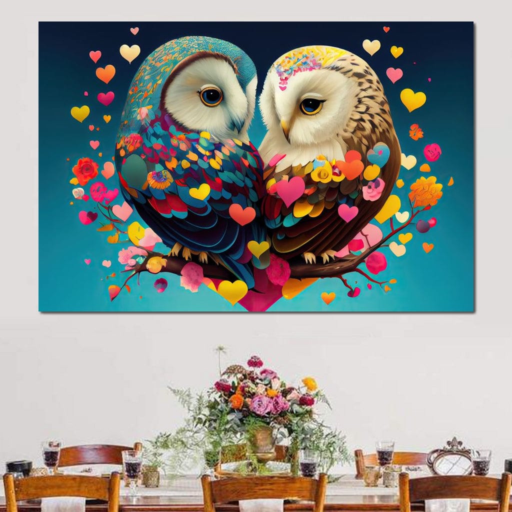 Tablou Canvas Premium LuxCanva® E1022, Bufnitele Iubirii, Bufnite, Conexiune, Iubire, Armonie, Inimi, Living Room, Culori vibrante