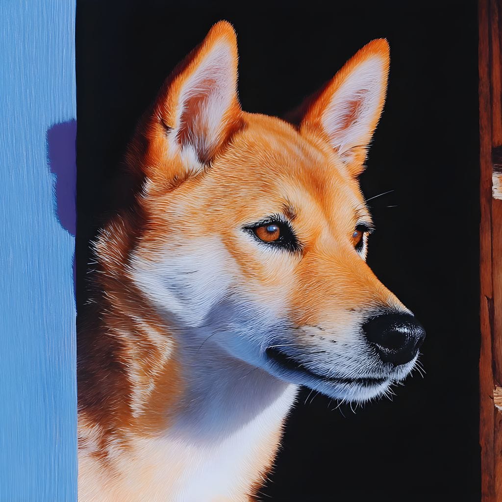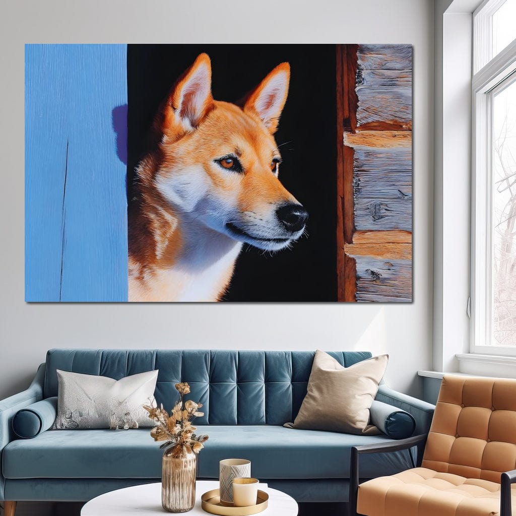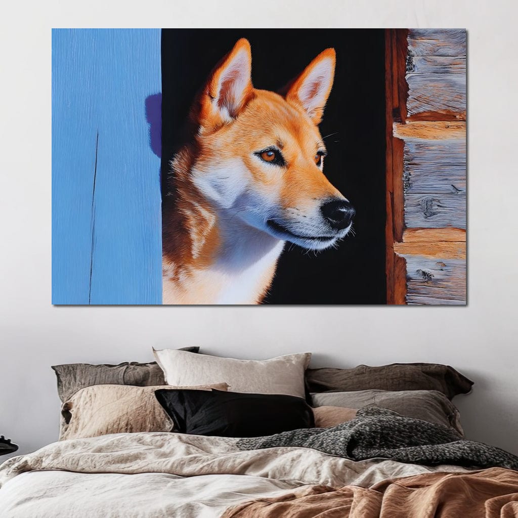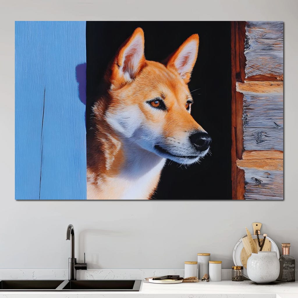 Tablou Canvas Premium, LuxCanva® M1295, Gardianul Zorilor, Rustic, Cabana, Lemn, Shiba, Catel, Zori, Privire, Profil, Umbra, Liniste, Portret, Birou, Living, Camera Copil - 40 X 60