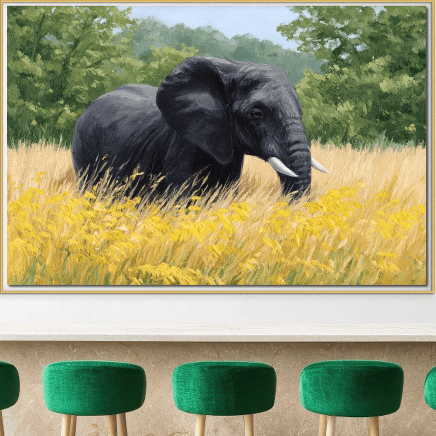 Tablou Canvas Premium, LuxCanva® M1324, Tacerea Pajistii, Peisaj, Natura, Pajiste, Verde, Elefant, Colti, Vegetatie, Pictura, Animal, Pasnic, Adiere, Birou, Living, Camera Copil - 40 X 60 / Doar Sasiu Lemn / Normala