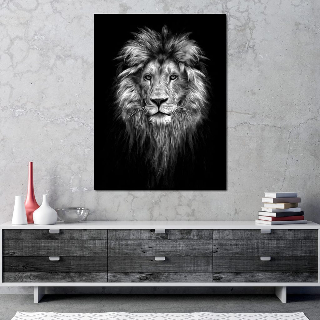 Tablou Canvas Premium, LuxCanva® M1382, Regele Intunericului, Leu, Animale, Salbatic, Portret, Chip, Monocrom, Alb si Negru, Mister, Abstract, Birou, Living, Camera Copil - 45 X 60