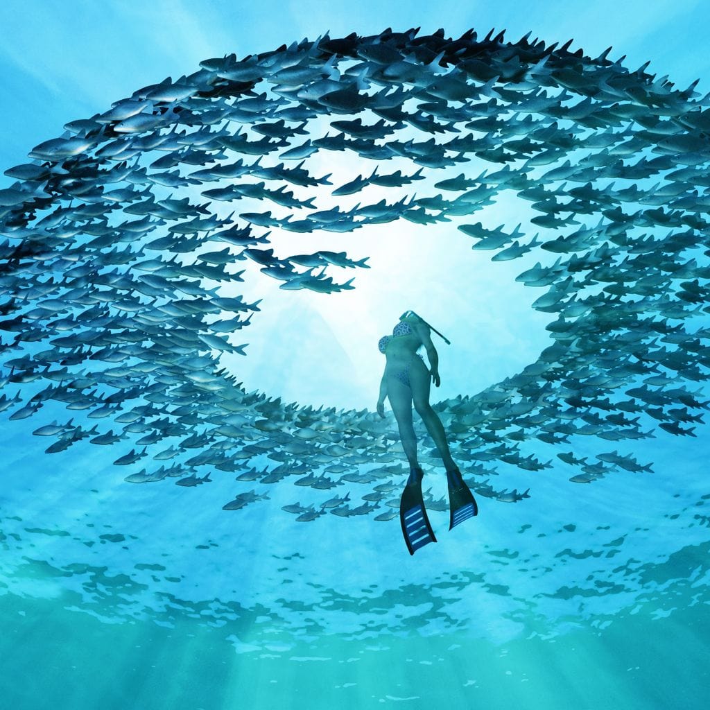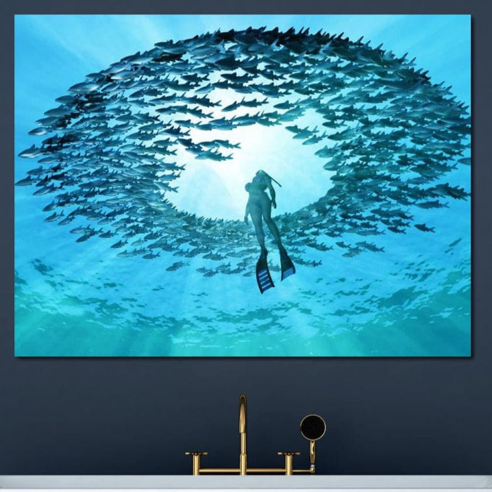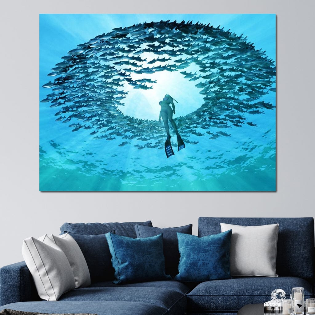 Tablou Canvas Premium, LuxCanva® M1415, Imbratisarea Oceanului, Scafandru, Apa, Ocean, Pesti, Cerc, Vartej, Adancuri, Lumina, Dans, Birou, Living, Camera Copil - 45 X 60 / Doar Sasiu Lemn / Normala