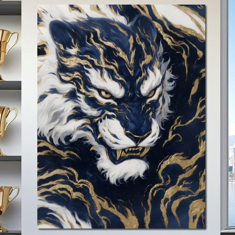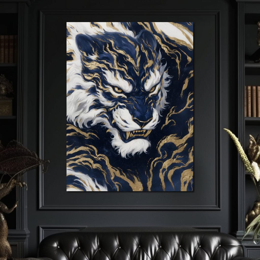 Tablou Canvas Premium, LuxCanva® M1430, Furia Zen, Auriu, Albastru, Tigru, Bestie, Felina, Oriental, Razboinic, Flacari, Colti, Spirit, Birou, Living, Camera Copil - 45 X 60 / Doar Sasiu Lemn / Normala