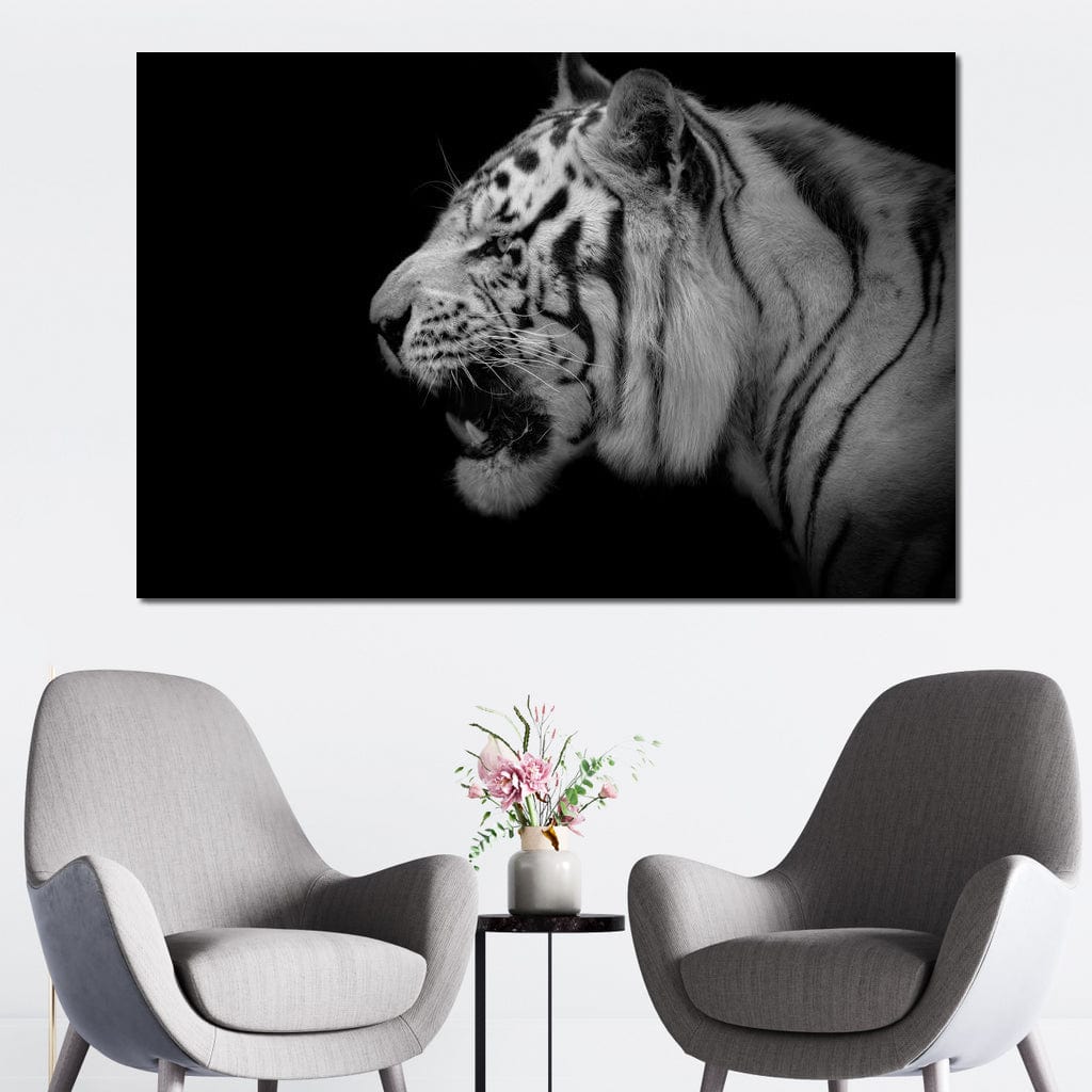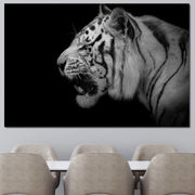 Tablou Canvas Premium, LuxCanva® M1432, Vanatorul din Umbra, Alb si Negru, Tigru, Felina, Bestie, Animal, Exotic, Salbatic, Profil, Dungi, Colti, Birou, Living, Camera Copil