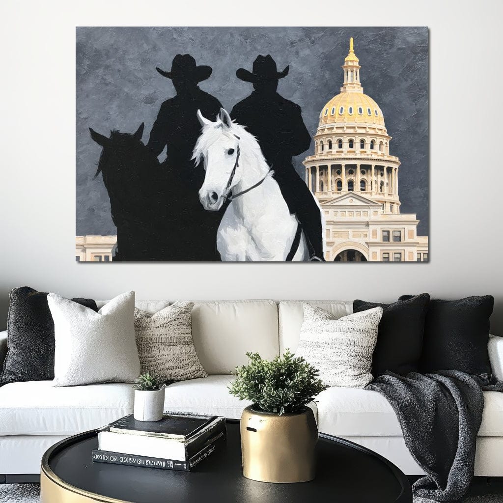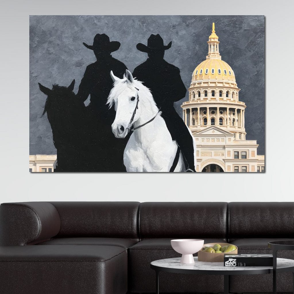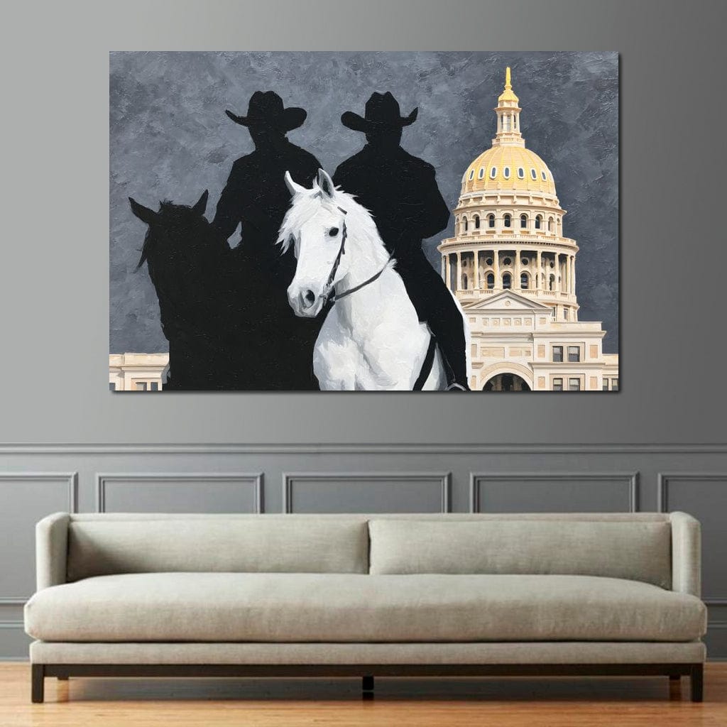Tablou Canvas Premium, LuxCanva® M1541, Patrula Nevazuta, Calareti, Umbre, Urban, Cal Alb, Cowboy, Silueta, Mister, Cladire, Dormitor, Birou, Living, Camera Copil - 40 X 60 / Doar Sasiu Lemn / Normala