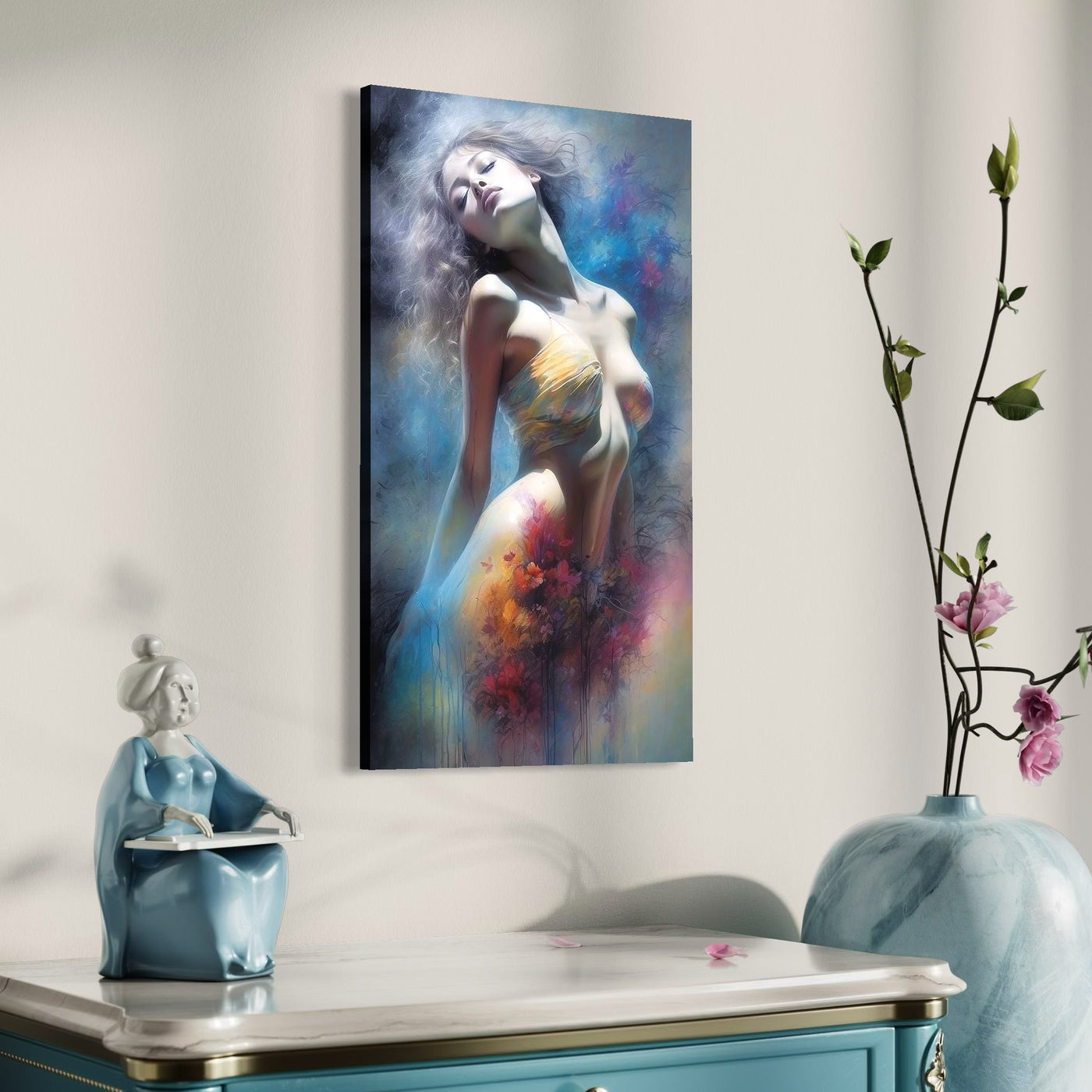 Tablou Canvas Premium, LuxCanva® P1048, Spiritul Primaverii, Lumina, Femeie, Vis, Renastere, Culori, Trup, Flori, Miscare, Armonie, Mistic, Emotie, Natura, Traire, Living, Dormitor - 40 X 70 / Doar Sasiu Lemn / Normala