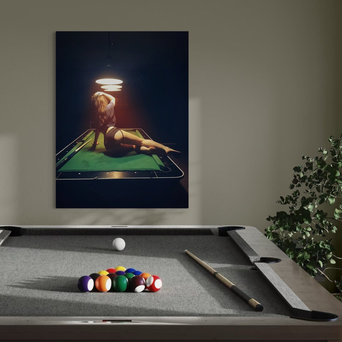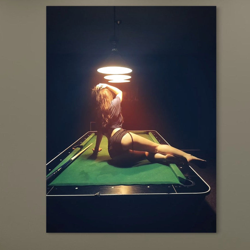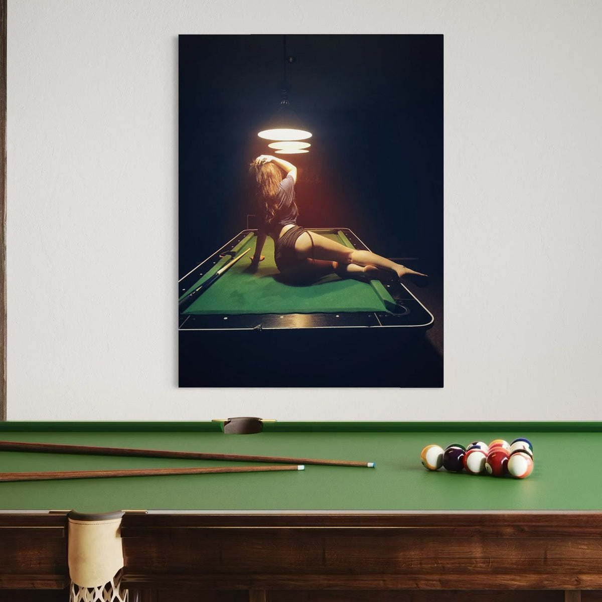Tablou Canvas Premium, LuxCanva® P1056, Taina Biliardului, Joc, Sala, Noapte, Masa, Verde, Silueta, Atmosfera, Distractie, Senzualitate, Cinematic, Tac, Bile, Seara, Living, Dormitor - 45 X 60 / Doar Sasiu Lemn / Normala