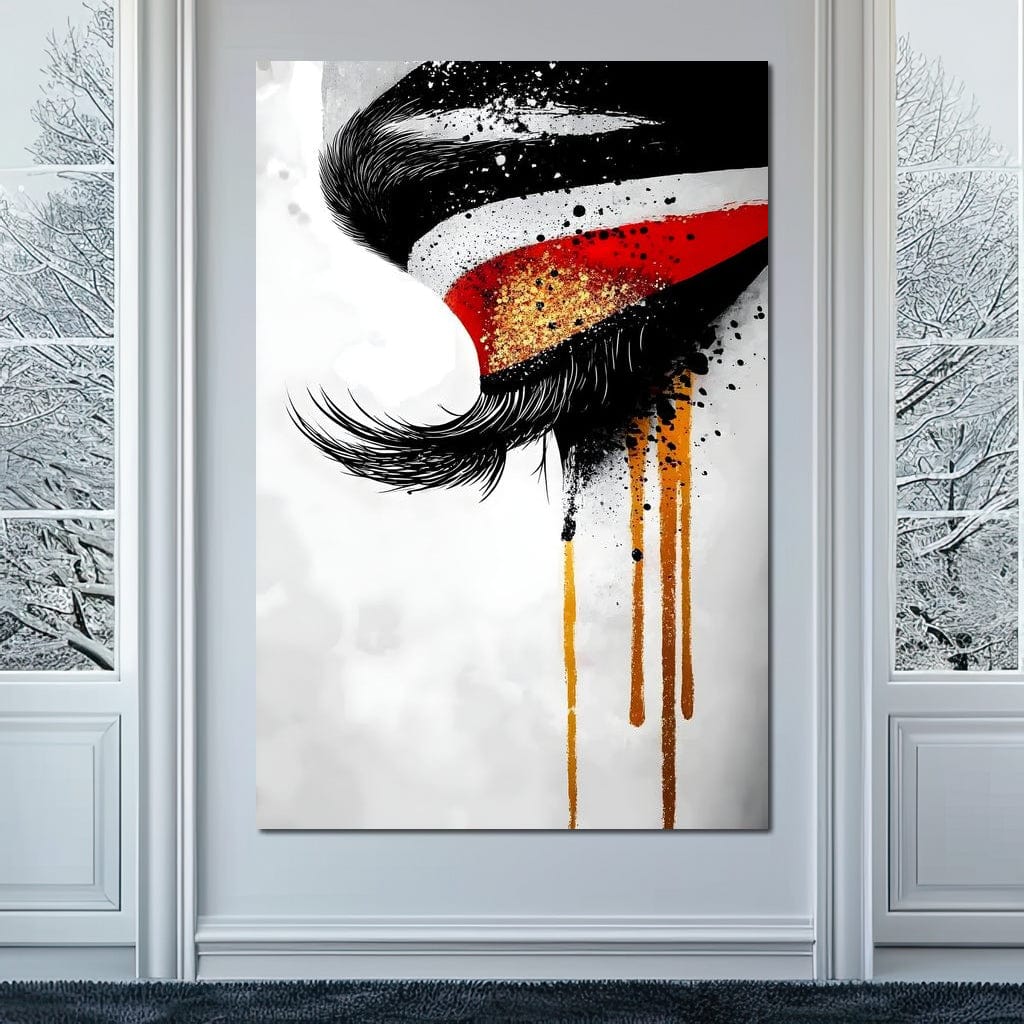 Tablou Canvas Premium, LuxCanva® G1180, Privirea care Curge, Ochi, Gene, Lacrimi, Tacere, Durere, Emotie, Drama, Rosu, Galben, Negru, Stropi, Suferinta, Birou, Living, Dormitor - 40 X 60