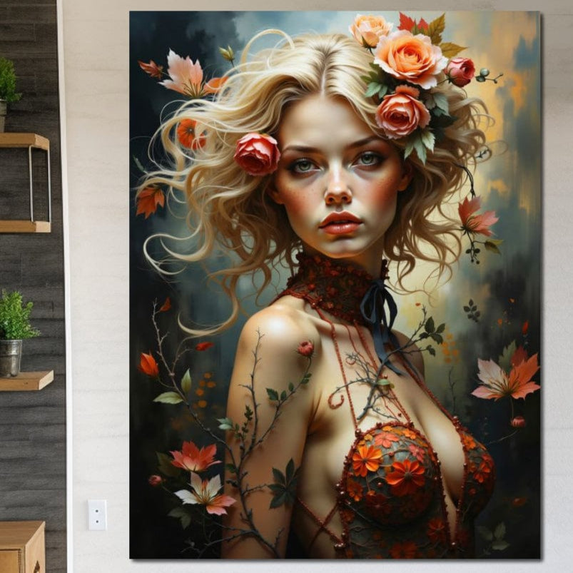 Tablou Canvas Premium, LuxCanva® G1167, Femeia din Padure, Fantastic, Flori, Natura, Romantic, Mistic, Zeita, Boem, Basm, Salbatica, Rochie, Florala, Contopire, Blonda, Birou, Living, Dormitor - 45 X 60