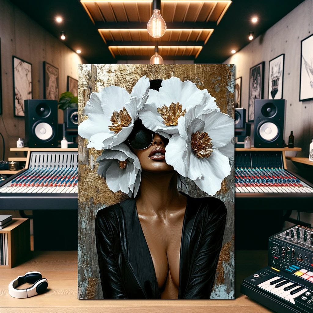 Tablou Canvas Premium, LuxCanva® G1189, Imparateasa Tacuta, Petale, Aur, Ochelari, Piele, Feminitate, Puternica, Lux, Silueta, Tacere, Liniste, Glamour, Artistic, Birou, Living, Dormitor - 60 X 90
