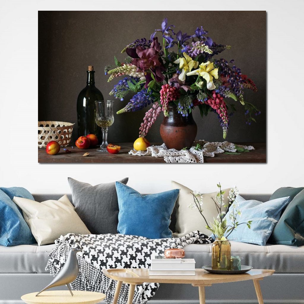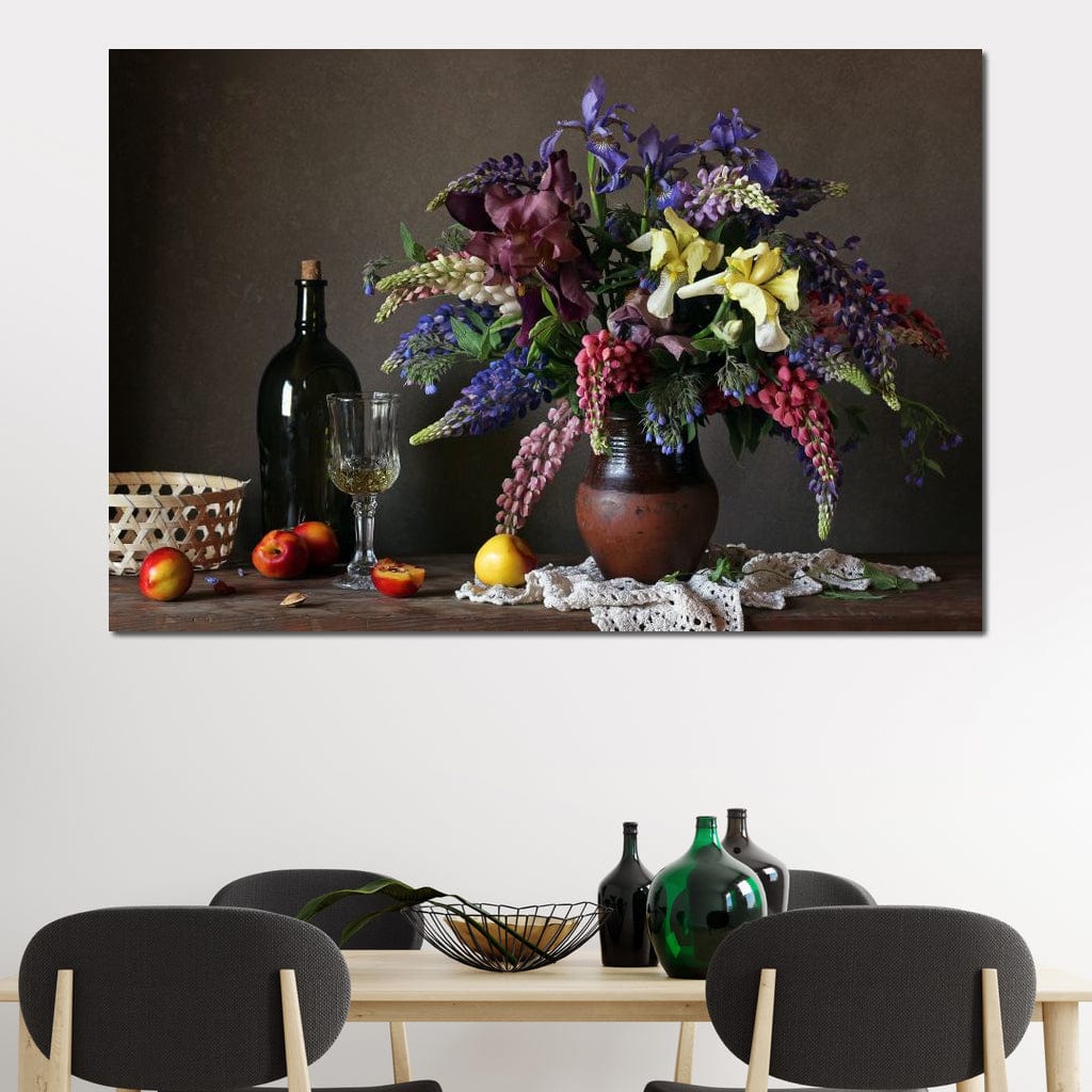 Tablou Canvas Premium, LuxCanva® N1101, Rapsodie Rustica, Flori, Fructe, Vaza, Flori, Buchet, Sticla, Vin, Pahar, Bautura, Masa, Traditional, Pub, Bar, Lounge, Restaurant, Bucatarie