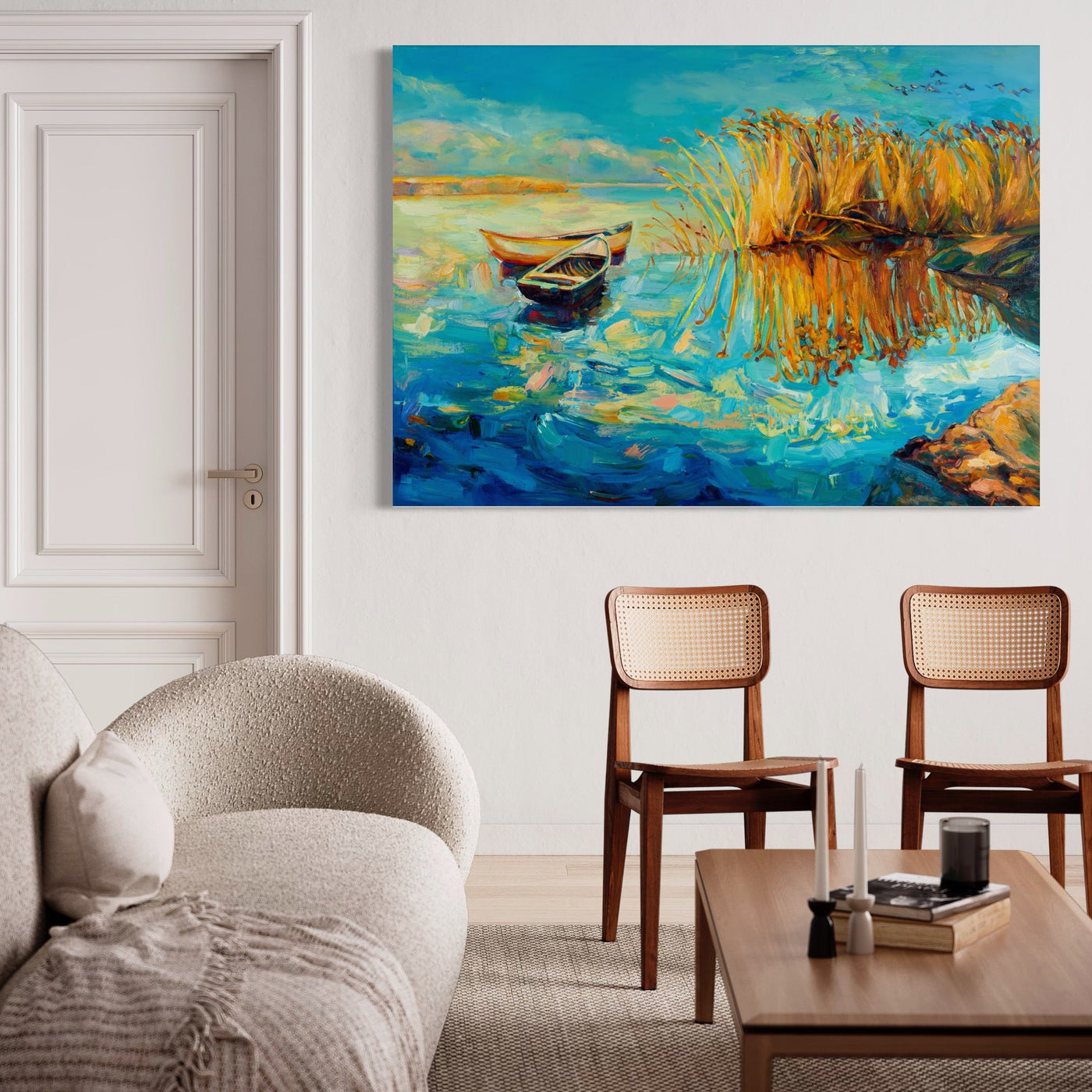 Tablou Canvas Premium LuxCanva® A1096, Doua Barci , Stuf, Lac, Pasari, Culori Vibrante - 50 X 70