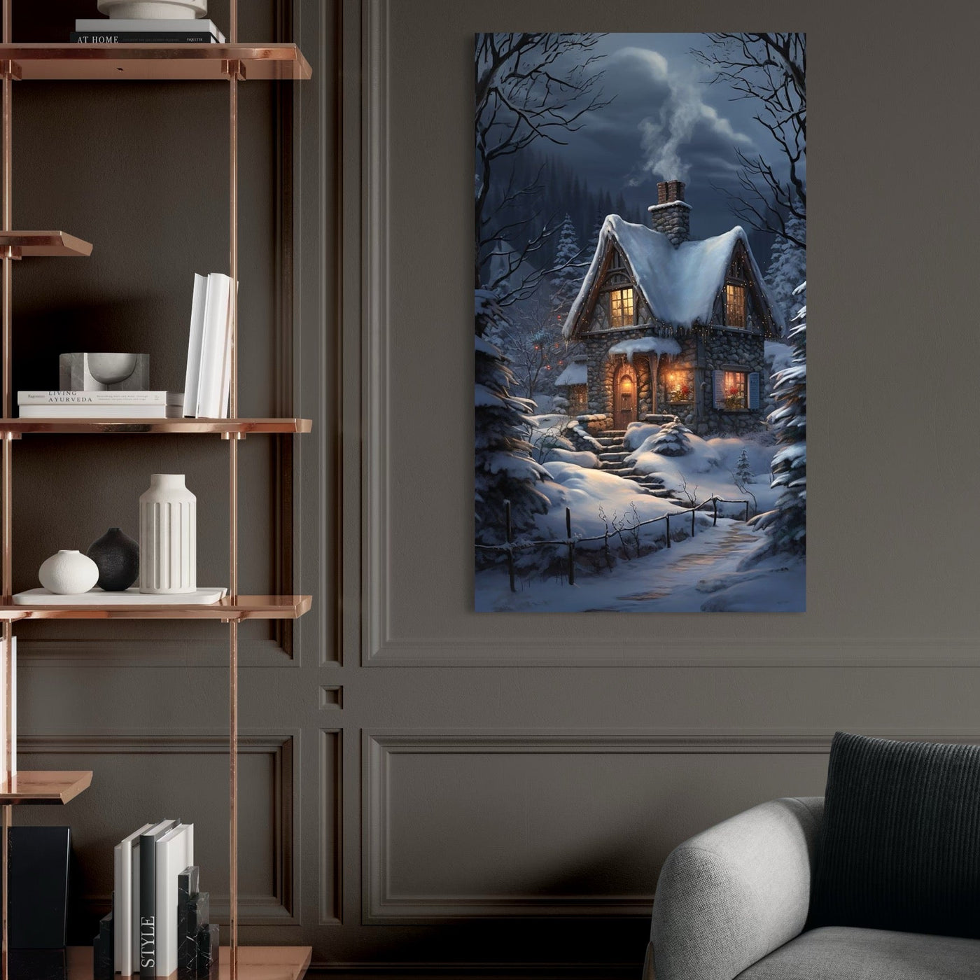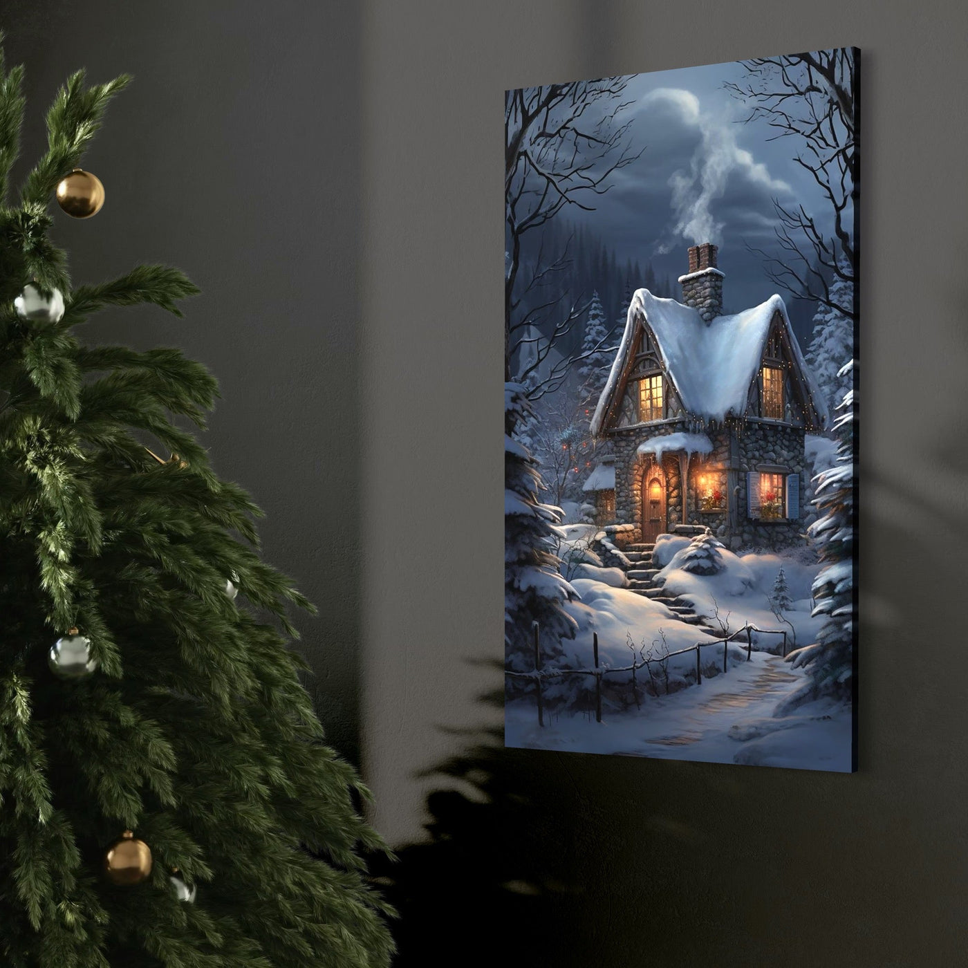 Tablou Canvas Premium, LuxCanva® D1117, Casa de Sub Zapada, Lumina, Noapte, Iarna, Cabana, Munte, Zapada, Horn, Fum, Ger, Brazi, Atmosfera, Basm, Caldura, Living, Dormitor - 40 X 70 / Doar Sasiu Lemn / Normala
