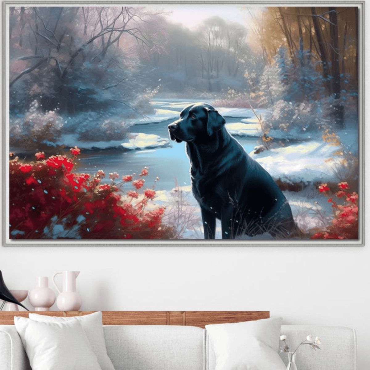 Tablou Canvas Premium, LuxCanva® M1266, Sub Mantia Zapezii, Labrador, Caine, Iarna, Anotimp, Zapada, Flori, Vegetatie, Copaci, Prieten, Peisaj, Lumina, Birou, Living, Camera Copil - 60 X 90
