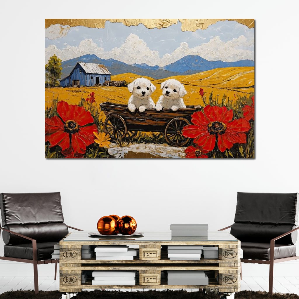Tablou Canvas Premium, LuxCanva® M1285, Prietenie printre Maci, Catei, Vara, Caruta, Anotimp, Auriu, Flori, Maci, Peisaj, Hambar, Joaca, Dealuri, Copilarie, Birou, Living, Camera Copil - 40 X 60