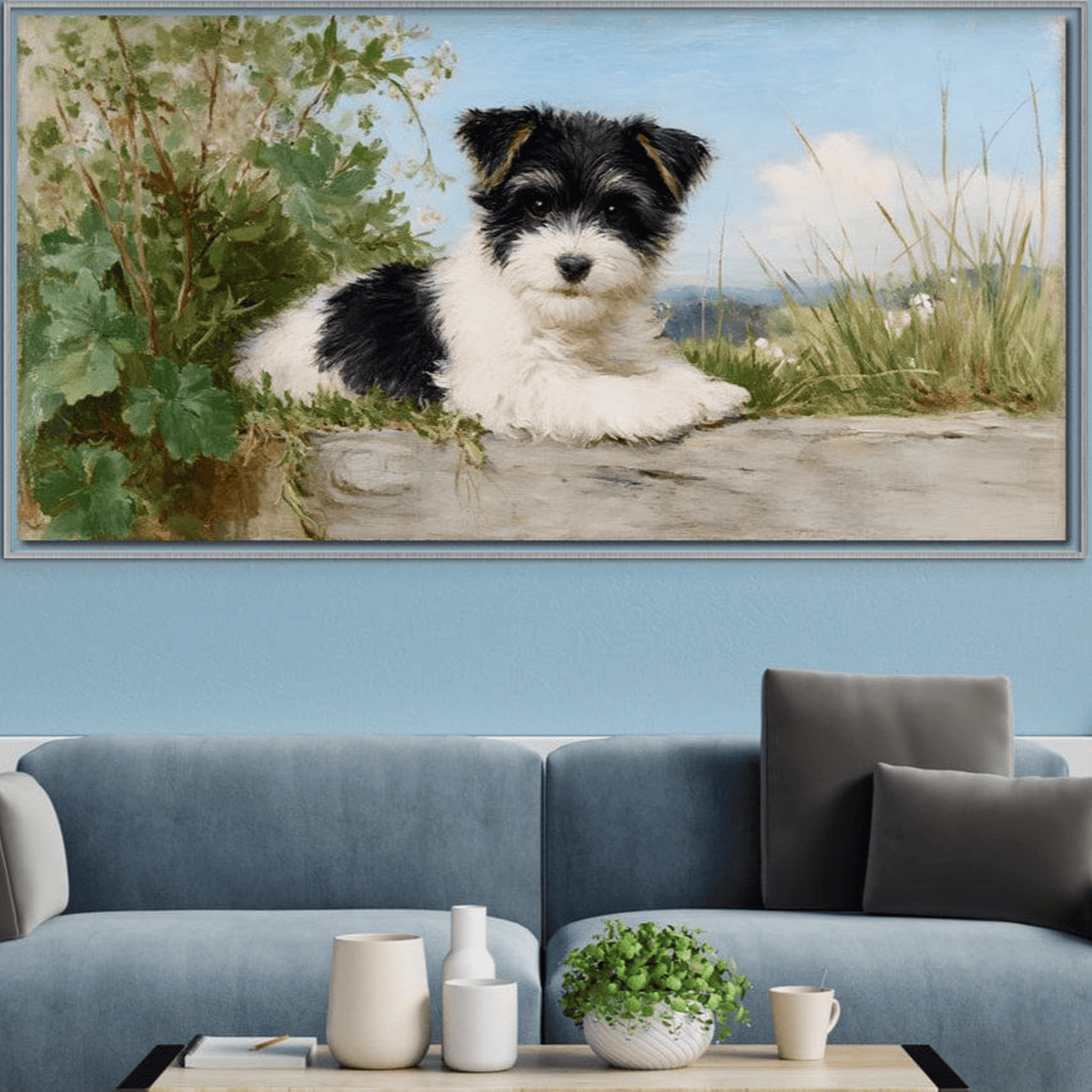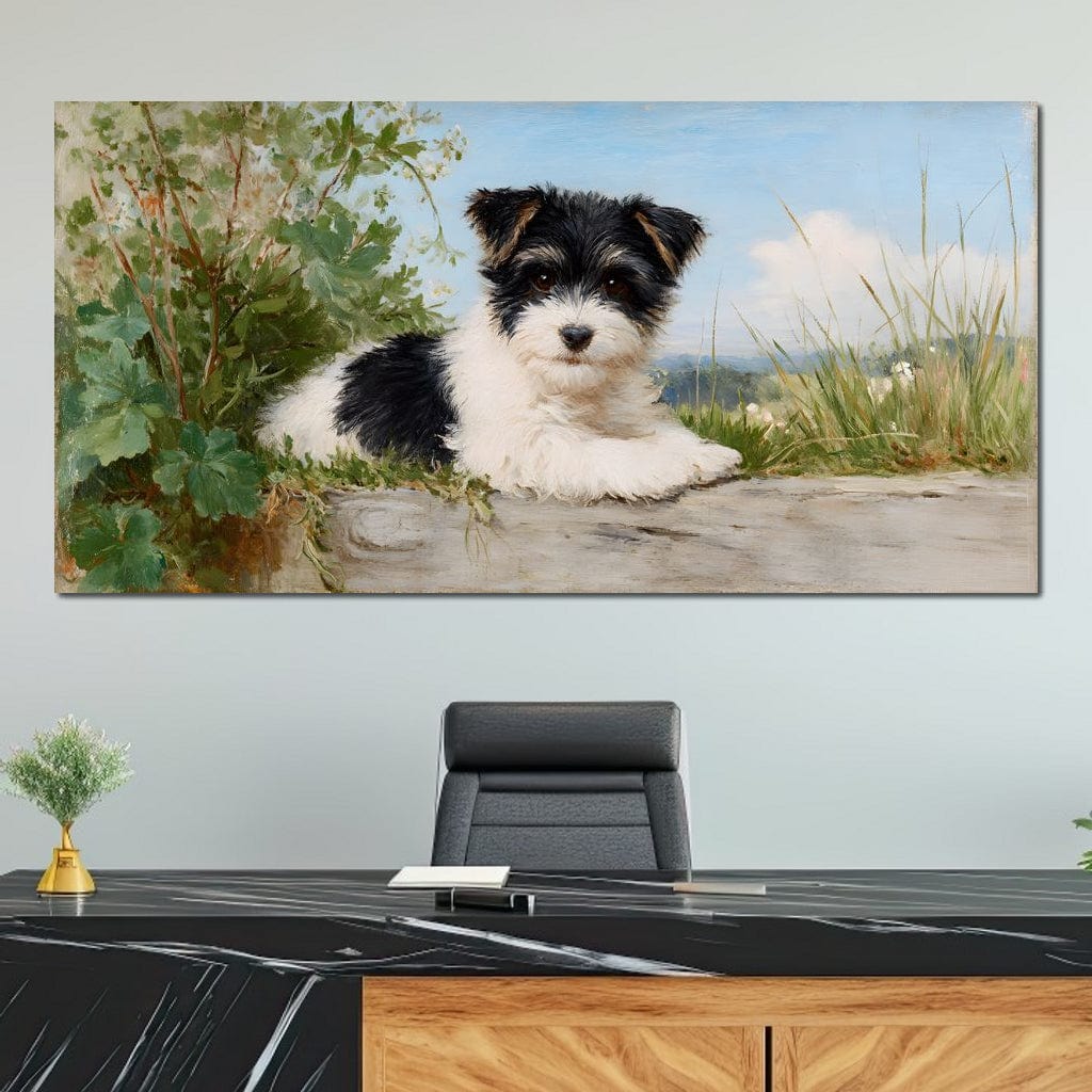 Tablou Canvas Premium, LuxCanva® M1298, Vreme de Joaca, Catel, Pui, Blanita, Iarba, Inocent, Rustic, Copilarie, Privire, Portret, Pictura, Birou, Living, Camera Copil