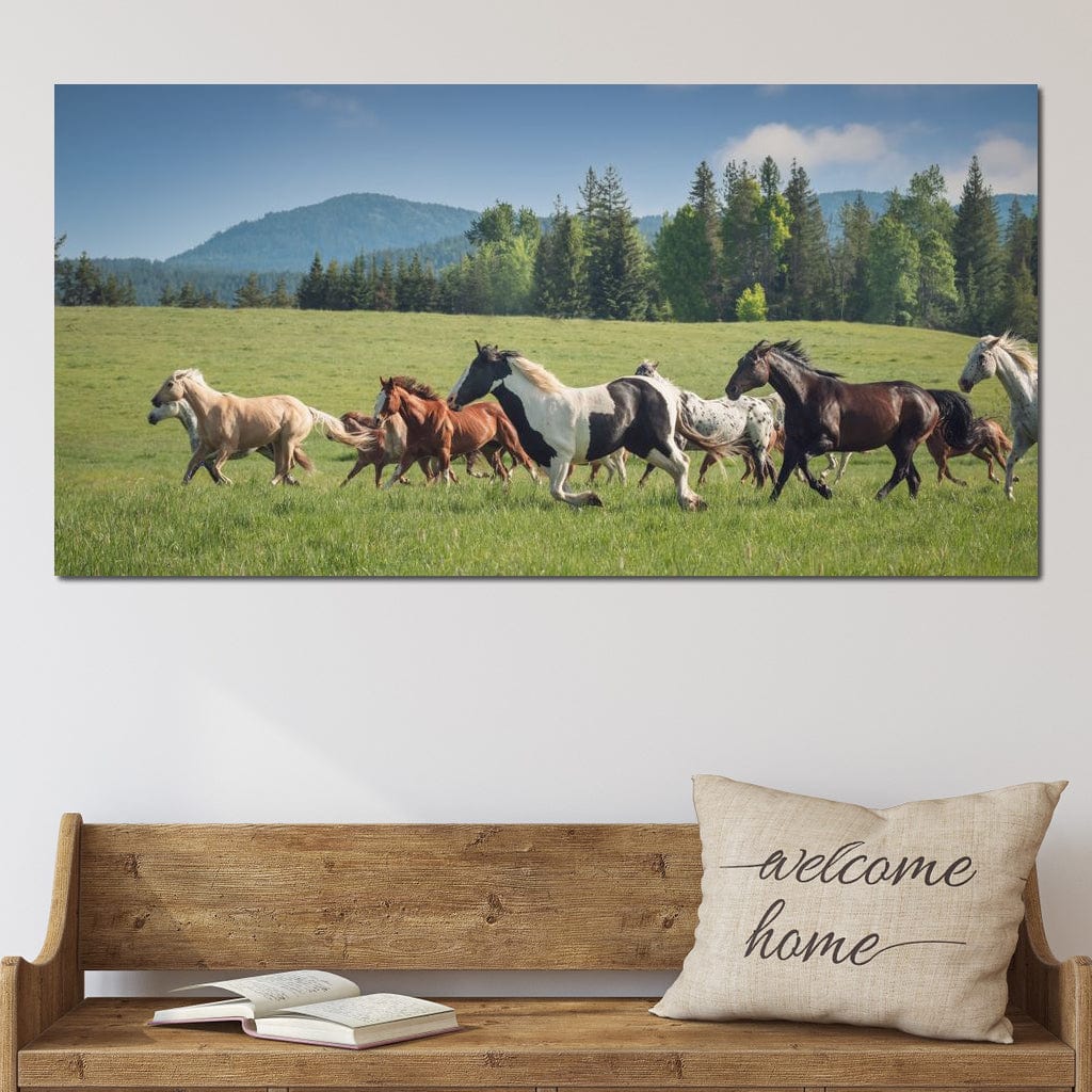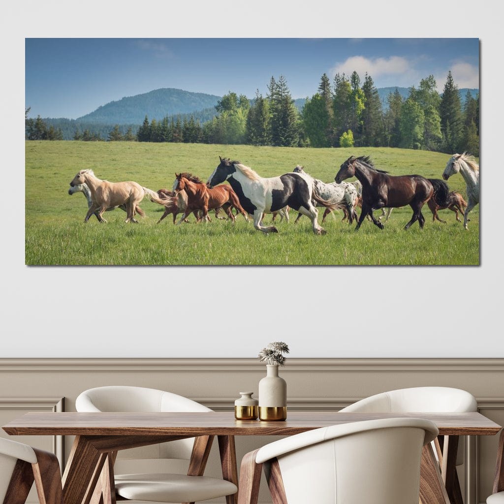Tablou Canvas Premium, LuxCanva® M1359, Galop in Vant de Vara, Pajiste, Natura, Copaci, Senin, Iarba, Salbaticie, Miscare, Grup, Cai, Viteza, Peisaj, Birou, Living, Camera Copil - 50 X 100