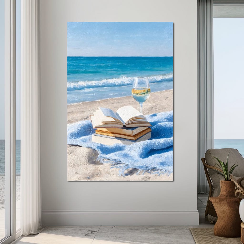 Tablou Canvas Premium, LuxCanva® N1087, Lectura pe Valuri, Carti, Pagini, Nisip, Mare, Ocean, Plaja, Vin Alb, Relaxare, Vacanta, Bautura, Pub, Bar, Lounge, Restaurant, Bucatarie
