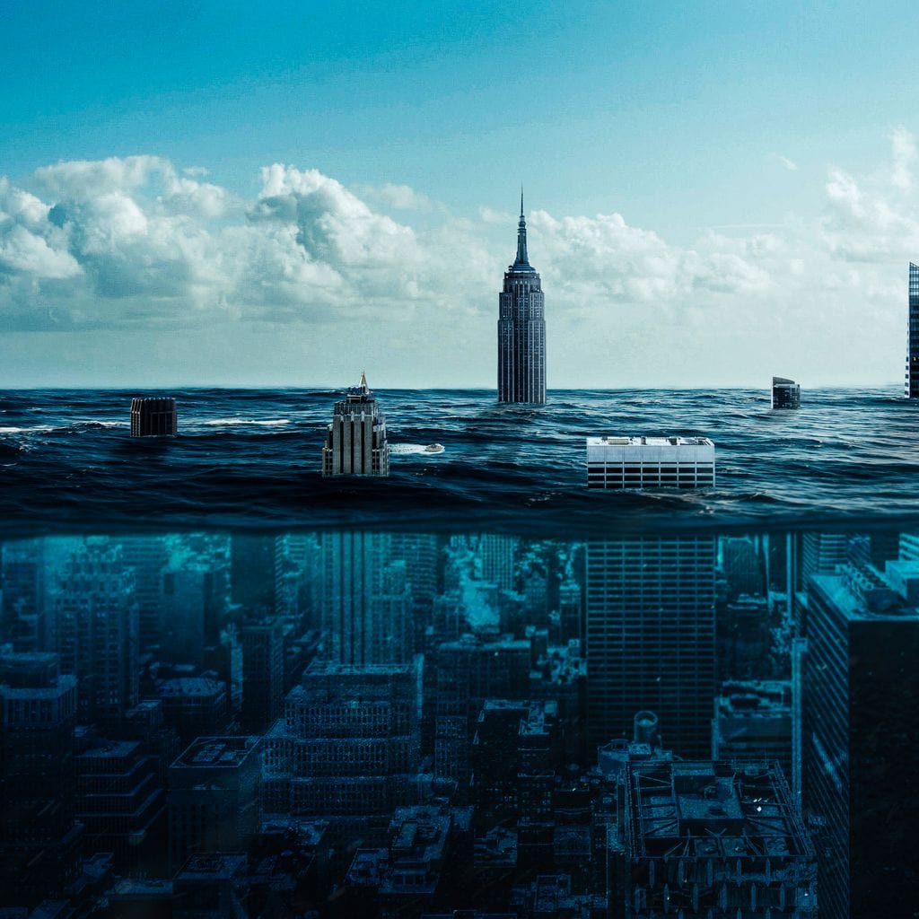 Tablou Canvas Premium, LuxCanva® O1060, Scufundarea Metropolei, Oras, Inecat, Ocean, Adancuri, Colaps, Valuri, Ruina, Eternitate, Abis, Fragil, Apus, New York, Cladiri, Ocean, Birou, Living, Dormitor - 40 X 60 / Doar Sasiu Lemn / Normala