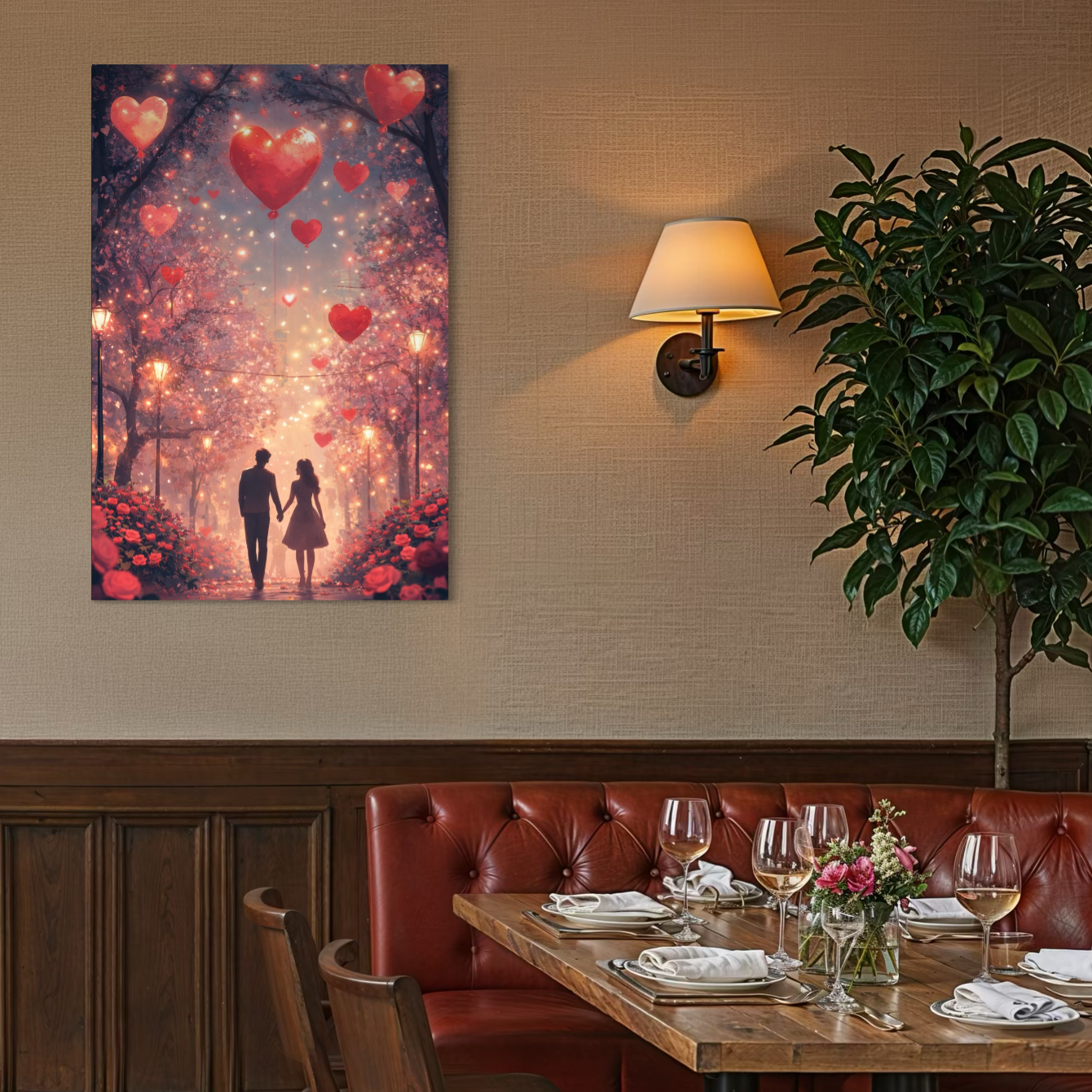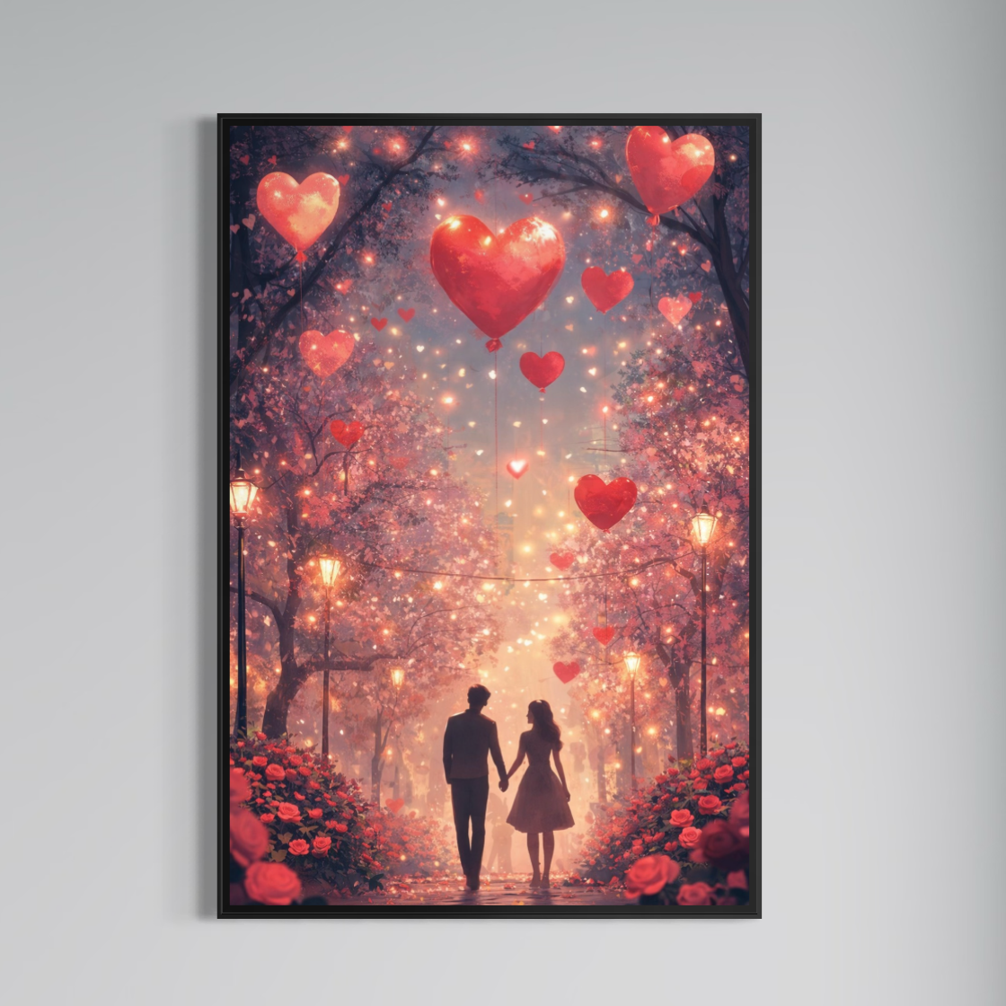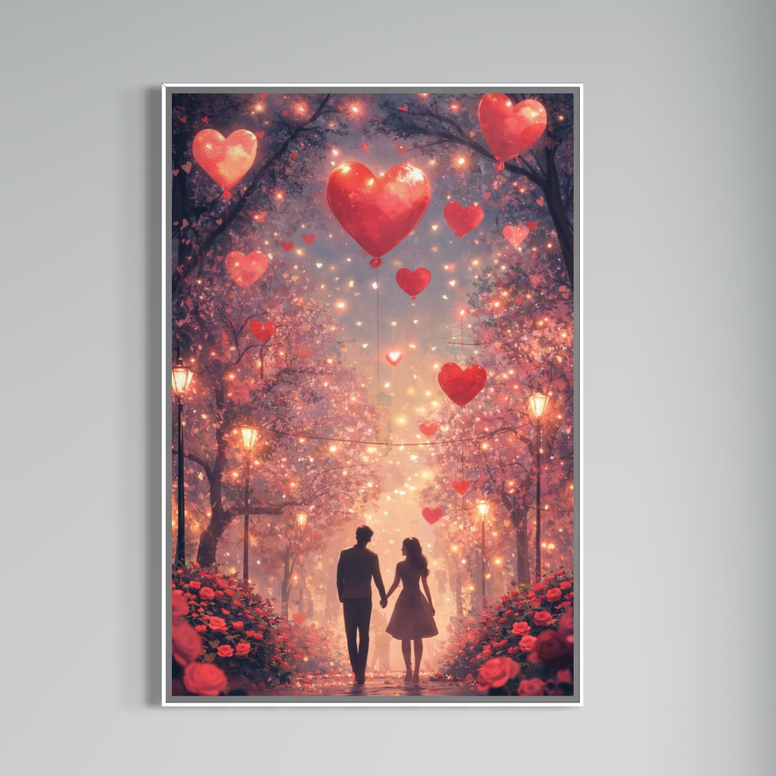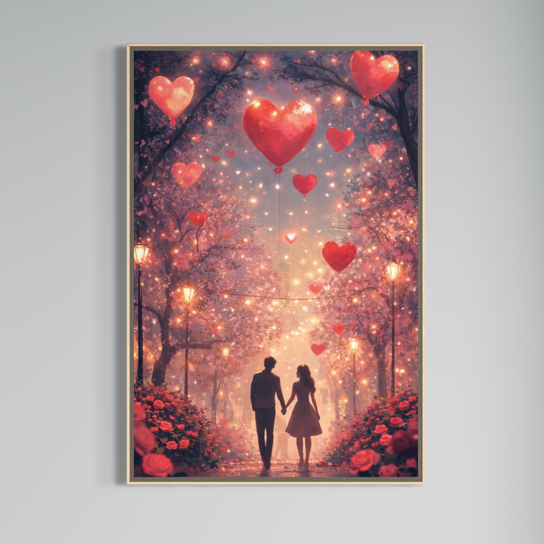 Tablou Canvas Premium, LuxCanva® E1063, Aleea Inimilor Aprinse, Dragoste, Inima, Iubire, Plimbare, Indragostiti, Cuplu, Alee, Parc, Noapte, Feeric, Romantism, Arta, Living, Dormitor - 40 X 60