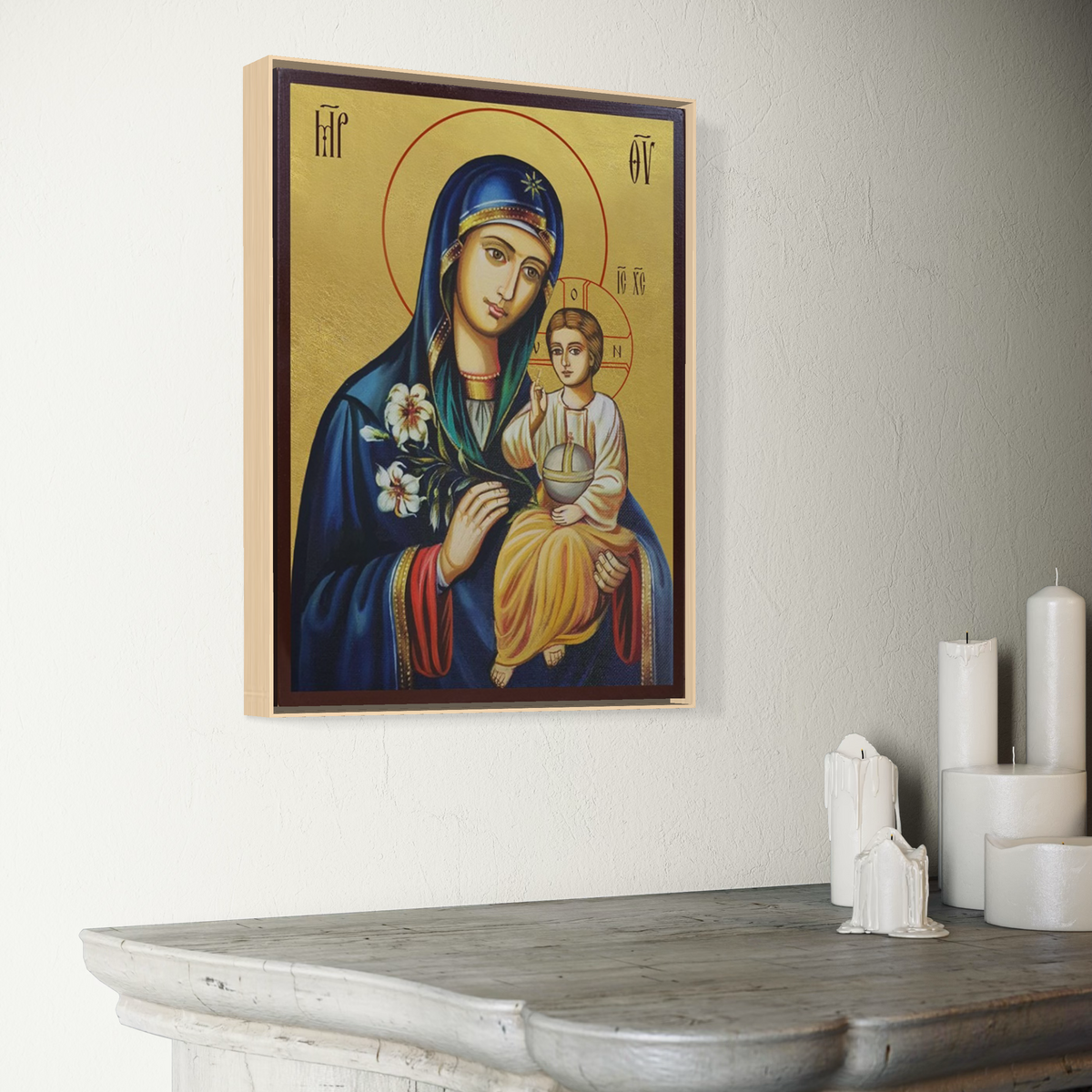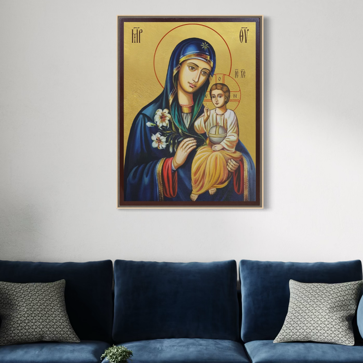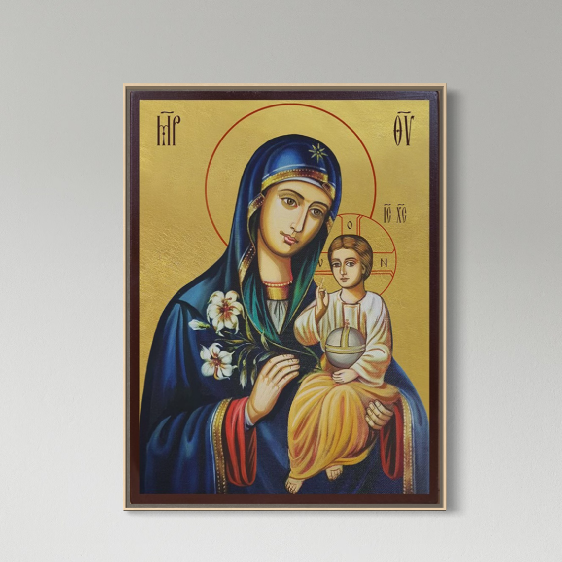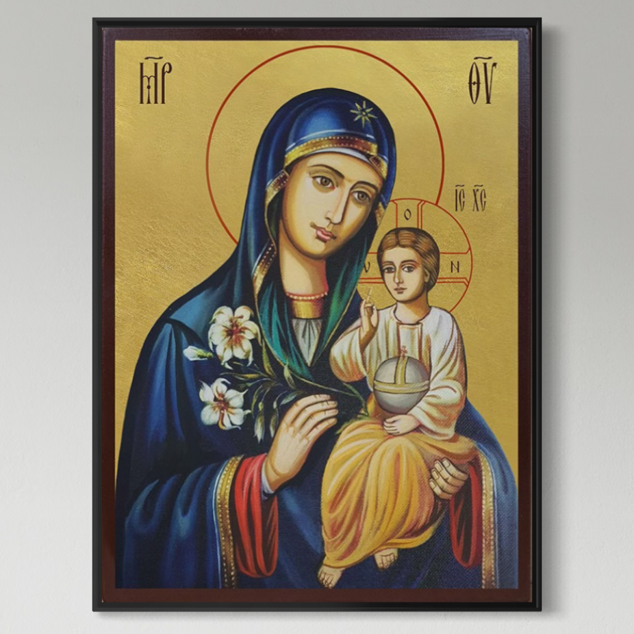 Tablou Canvas Premium, LuxCanva® H1074, Maica Domnului cu Floare de Crin, Icoana, Puritate, Har, Prunc, Iisus, Planta, Mantuire, Mangaiere, Ortodoxie, Fecioara, Living, Dormitor